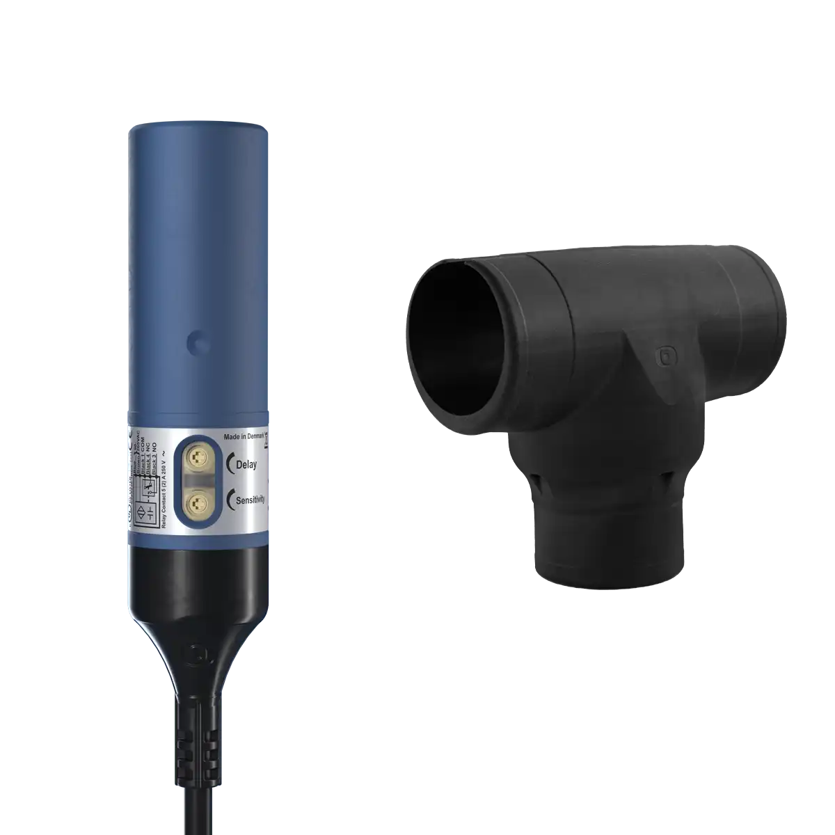 This sensor comes with smooth or threaded housing and with T-piece for mounting on a 40-60mm tube with conveying system.